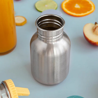 Dankzij het compacte formaat ligt de fles goed in kleine kinderhanden en past hij moeiteloos in een rugzak of lunchbox. De lekvrije schroefdop met diepblauwe kleur sluit stevig af, zodat drinken veilig mee kan zonder lekken. De RVS binnenkant houdt smaken neutraal en is eenvoudig schoon te maken – perfect voor water, sap of smoothies.