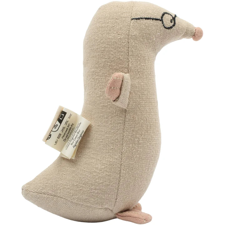 Maak kennis met Marvin de Mol, de wijze en nieuwsgierige mol uit de wereld van Fabelab. Deze zachte rammelaar van biologisch katoen is speciaal ontworpen voor kleine ontdekkers die hun zintuigen willen verkennen. Wanneer je kleintje met Marvin speelt, klinkt er een zacht rammelend geluid gecombineerd met een knisperend effect in zijn lijfje – perfect voor het stimuleren van gehoor en tastzin.