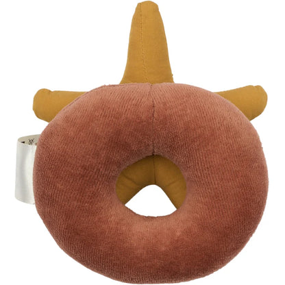 De rammelaar is gemaakt van biologisch katoen met een fluweelzachte afwerking, wat zorgt voor een heerlijk tactiel gevoel in kleine handjes. Binnenin zit een zacht rammelend belletje dat de auditieve ontwikkeling van je baby stimuleert. De warme tinten Ash Rose brengen rust en een vleugje strandgevoel in de babykamer.