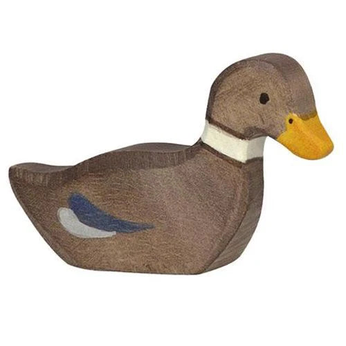 Met zijn gestroomlijnde, zwemmende houding lijkt de Holztiger eend zo uit het water te glijden. Perfect te combineren met andere Holztiger dieren zoals de staande eend, het kuiken of de kip, voor een levendige boerderij- of vijverscène vol fantasie.