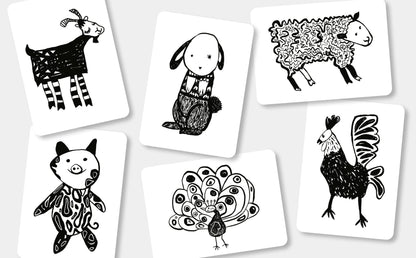 Op de kaarten staan lieve boerderijdieren zoals een koe, kip en schaap. De eenvoudige, speelse illustraties sluiten perfect aan bij wat baby’s kunnen waarnemen. Door regelmatig samen naar de kaarten te kijken, ondersteun je op een natuurlijke manier de ontwikkeling van het zicht en de hersenen.