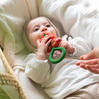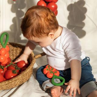 Een rammelaar die eruitziet als een trosje tomaten? Ja hoor – dat kan alleen van Oli & Carol komen! Deze vrolijke Tomaat Rammelaar is niet alleen een feest om naar te kijken, maar ook helemaal veilig om op te kauwen, te schudden en vast te grijpen. Gemaakt van 100% natuurlijk rubber van Hevea-bomen en gevuld met upcycled kersenpitten die een rustgevend rammeltje maken.