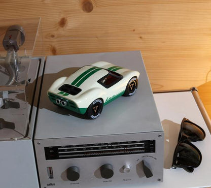 De Playforever Ken Cline brengt het gevoel van klassieke endurance-races uit de jaren zestig tot leven — in miniatuurvorm. De combinatie van een crèmekleurige carrosserie, diepgroene racestrepen en het stijlvolle “Ken”-logo aan de zijkant geeft deze auto een tijdloze, sportieve uitstraling.