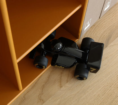 De Playforever Turbo Jet is een eerbetoon aan de legendarische Formule 1-auto’s uit de jaren tachtig. Een tijd waarin snelheid alles bepaalde en ontwerpers experimenteerden met grote spoilers, brede banden en pure turbokracht. De Jet straalt dat gevoel moeiteloos uit: glanzend zwart, voorzien van gouden details en het herkenbare nummer 7 – een klassiek icoon in miniatuurvorm.
